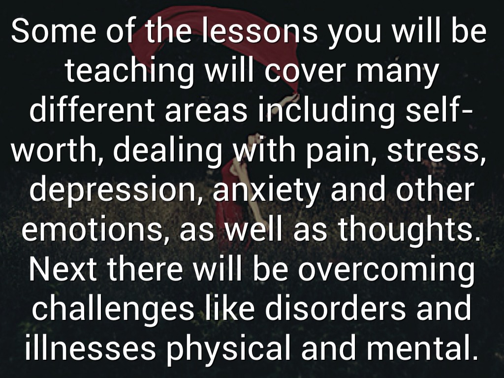 Some of the lessons you will be teaching will cover many different areas including self-worth, dealing with pain, stress, depression, anxiety and other emotions, as well as thoughts. Next there will be overcoming challenges like disorders and illnesses physical and mental.
