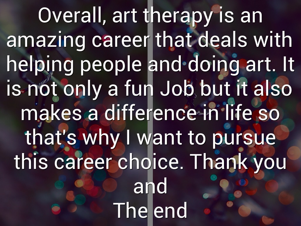Overall, art therapy is an amazing career that deals with helping people and doing art. It is not only a fun Job but it also makes a difference in life so that's why I want to pursue this career choice. Thank you and The end