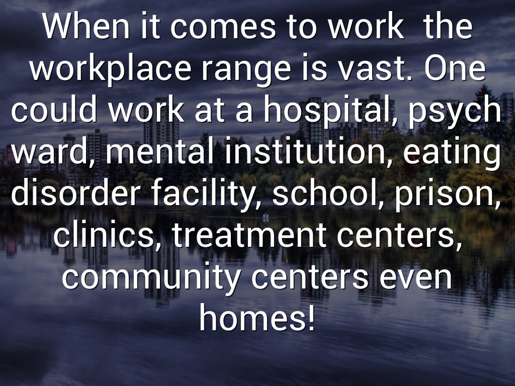 When it comes to work the workplace range is vast. One could work at a hospital, psych ward, mental institution, eating disorder facility, school, prison, clinics, treatment centers, community centers even homes!