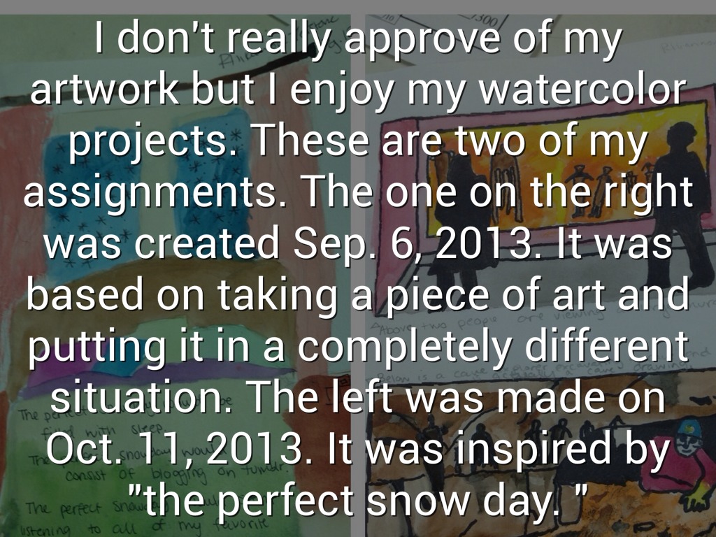 I don't really approve of my artwork but I enjoy my watercolor projects. These are two of my assignments. The one on the right was created Sep. 6, 2013. It was based on taking a piece of art and putting it in a completely different situation. The left was made on Oct. 11, 2013. It was inspired by "the perfect snow day. "