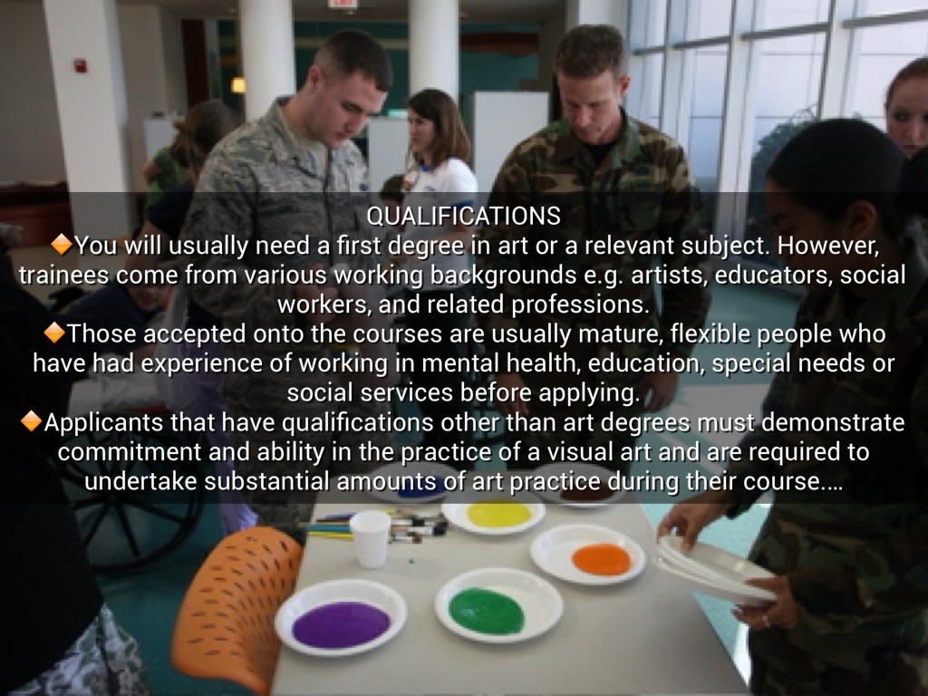 🔶You will usually need a first degree in art or a relevant subject. However, trainees come from various working backgrounds e.g. artists, educators, social workers, and related professions.