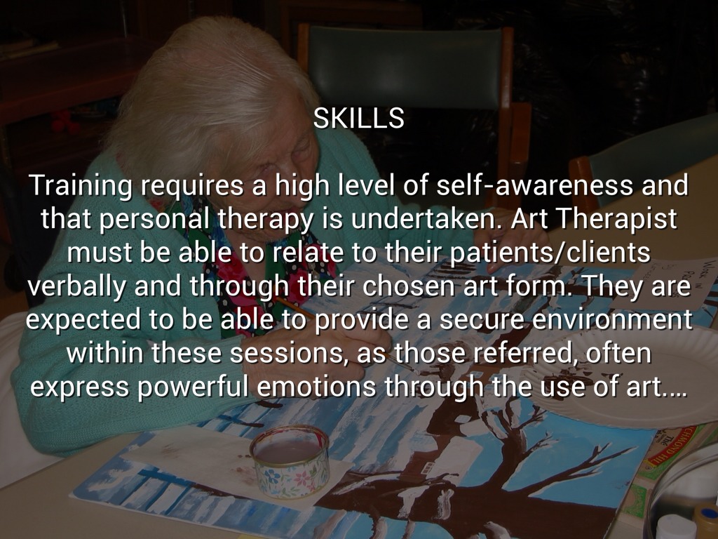 Training requires a high level of self-awareness and that personal therapy is undertaken. Art Therapist must be able to relate to their patients/clients verbally and through their chosen art form. They are expected to be able to provide a secure environment within these sessions, as those referred, often express powerful emotions through the use of art.