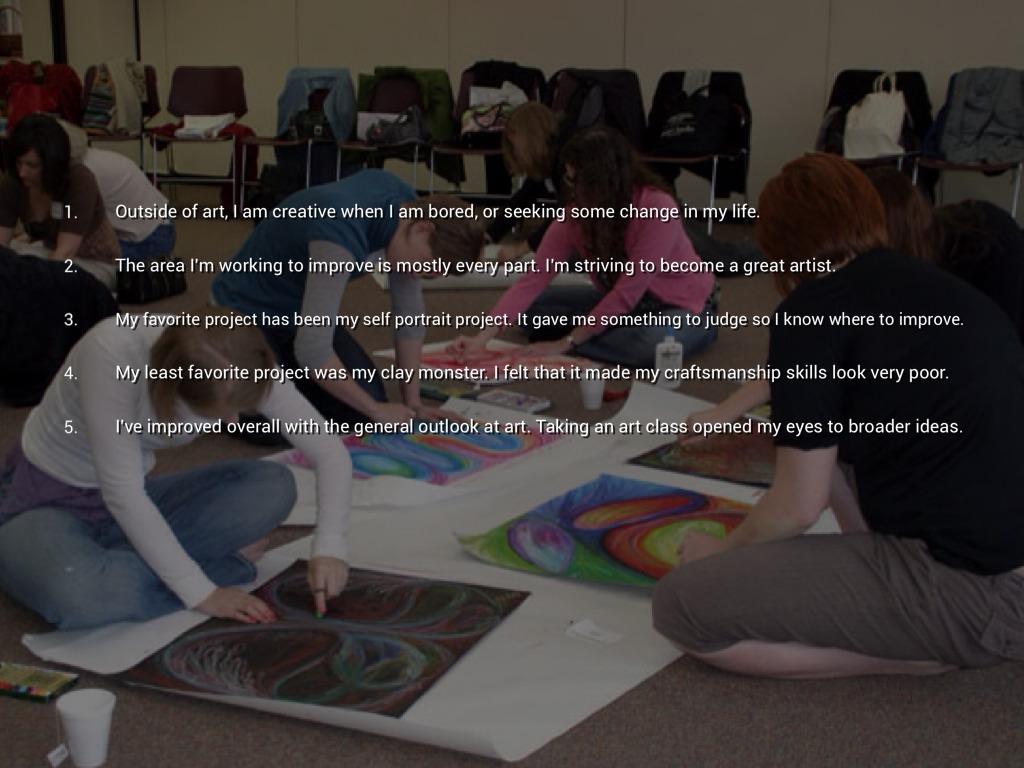 - I've improved overall with the general outlook at art. Taking an art class opened my eyes to broader ideas.
