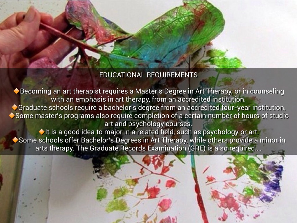 🔶Some schools offer Bachelor’s Degrees in Art Therapy, while others provide a minor in arts therapy. The Graduate Records Examination (GRE) is also required.