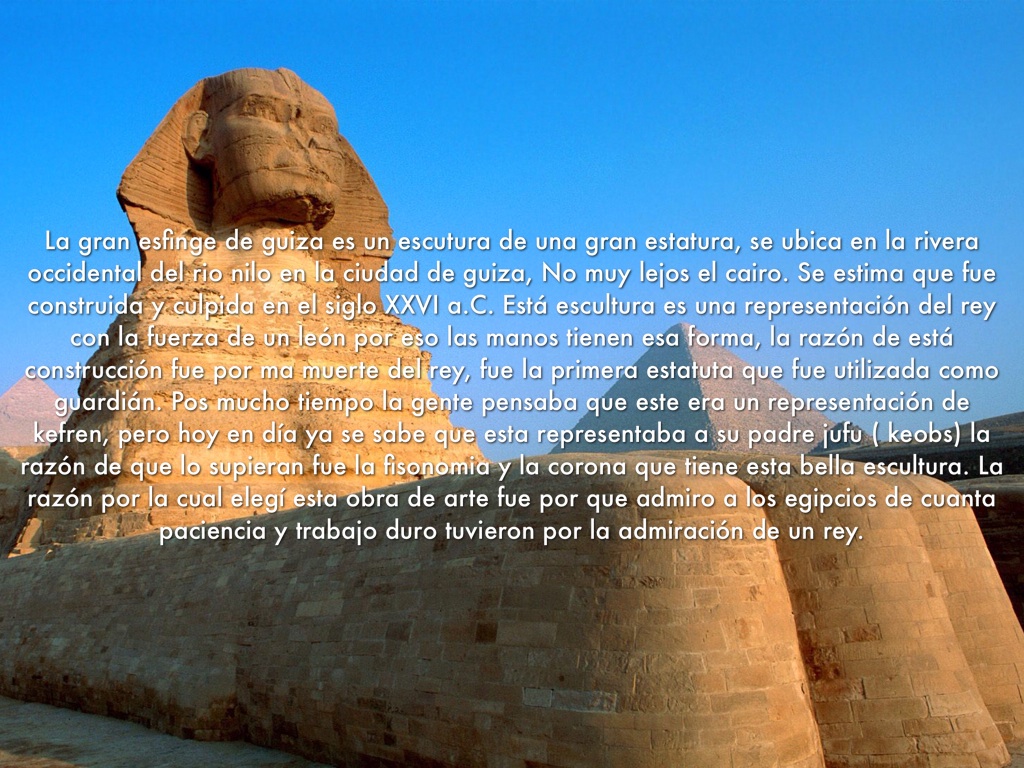 La gran esfinge de guiza es un escutura de una gran estatura, se ubica en la rivera occidental del rio nilo en la ciudad de guiza, No muy lejos el cairo. Se estima que fue construida y culpida en el siglo XXVI a.C. Está escultura es una representación del rey con la fuerza de un león por eso las manos tienen esa forma, la razón de está construcción fue por ma muerte del rey, fue la primera estatuta que fue utilizada como guardián. Pos mucho tiempo la gente pensaba que este era un representación de kefren, pero hoy en día ya se sabe que esta representaba a su padre jufu ( keobs) la razón de que lo supieran fue la fisonomia y la corona que tiene esta bella escultura. La razón por la cual elegí esta obra de arte fue por que admiro a los egipcios de cuanta paciencia y trabajo duro tuvieron por la admiración de un rey.
