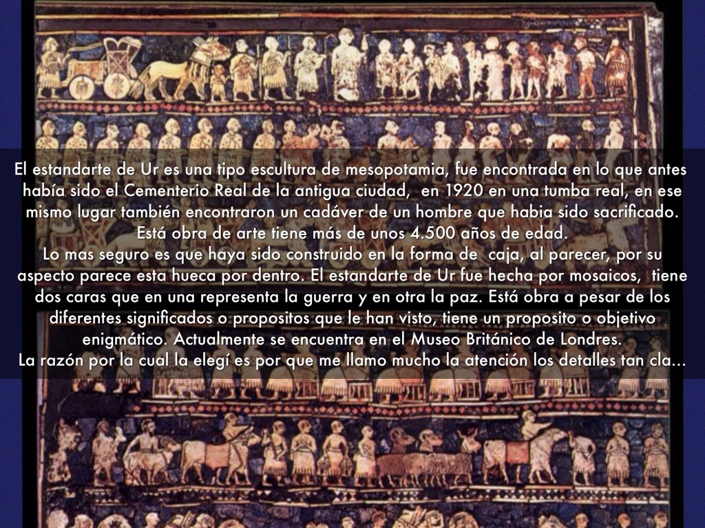 El estandarte de Ur es una tipo escultura de mesopotamia, fue encontrada en lo que antes había sido el Cementerio Real de la antigua ciudad, en 1920 en una tumba real, en ese mismo lugar también encontraron un cadáver de un hombre que habia sido sacrificado. Está obra de arte tiene más de unos 4.500 años de edad.