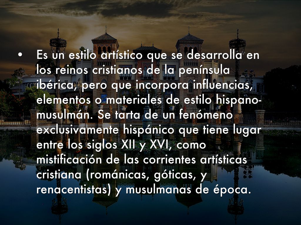Es un estilo artístico que se desarrolla en los reinos cristianos de la península ibérica, pero que incorpora influencias, elementos o materiales de estilo hispano-musulmán. Se tarta de un fenómeno exclusivamente hispánico que tiene lugar entre los siglos XII y XVI, como mistificación de las corrientes artísticas cristiana (románicas, góticas, y renacentistas) y musulmanas de época.