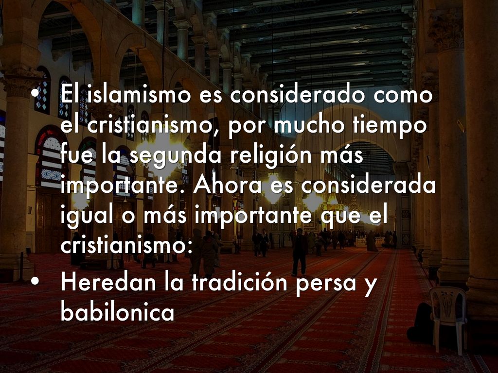 El islamismo es considerado como el cristianismo, por mucho tiempo fue la segunda religión más importante. Ahora es considerada igual o más importante que el cristianismo: