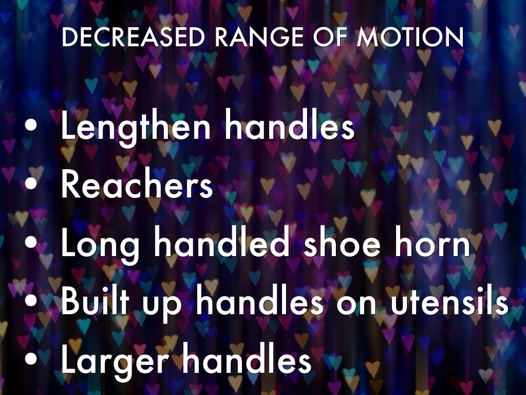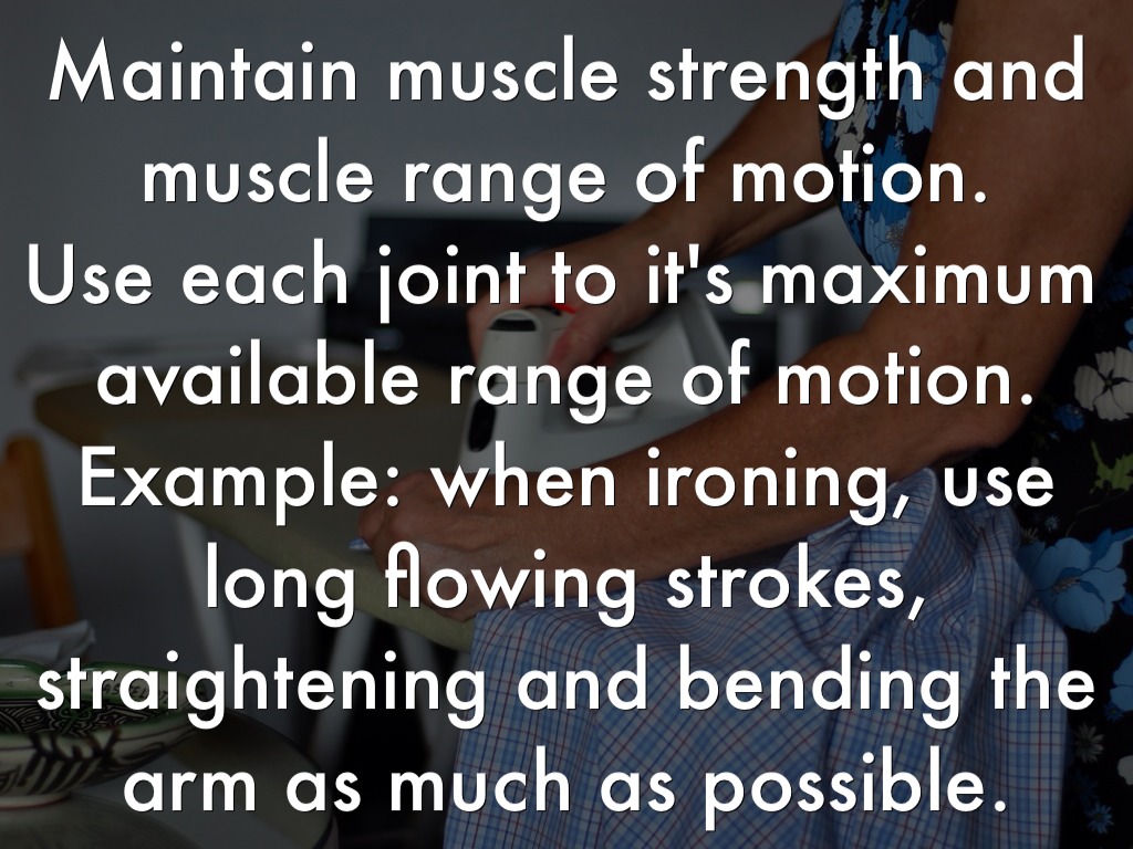Maintain muscle strength and muscle range of motion. Use each joint to it's maximum available range of motion. Example: when ironing, use long flowing strokes, straightening and bending the arm as much as possible.