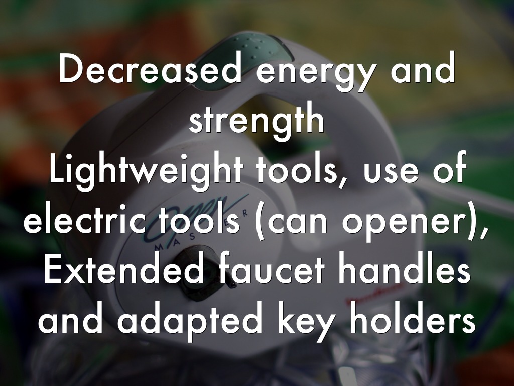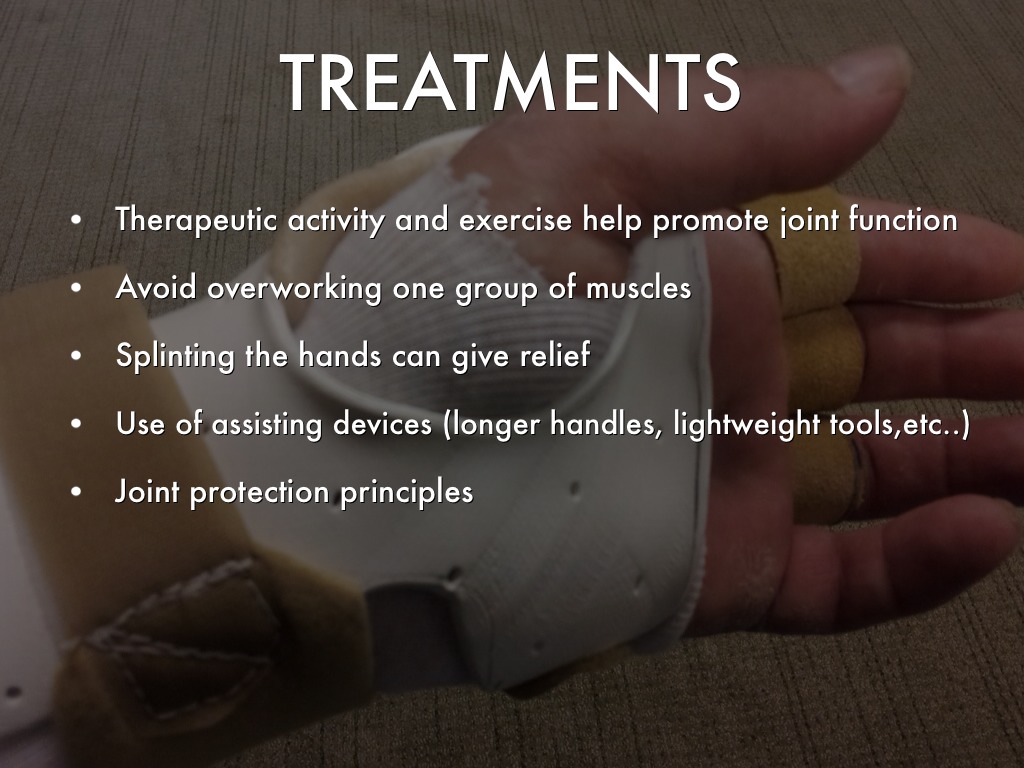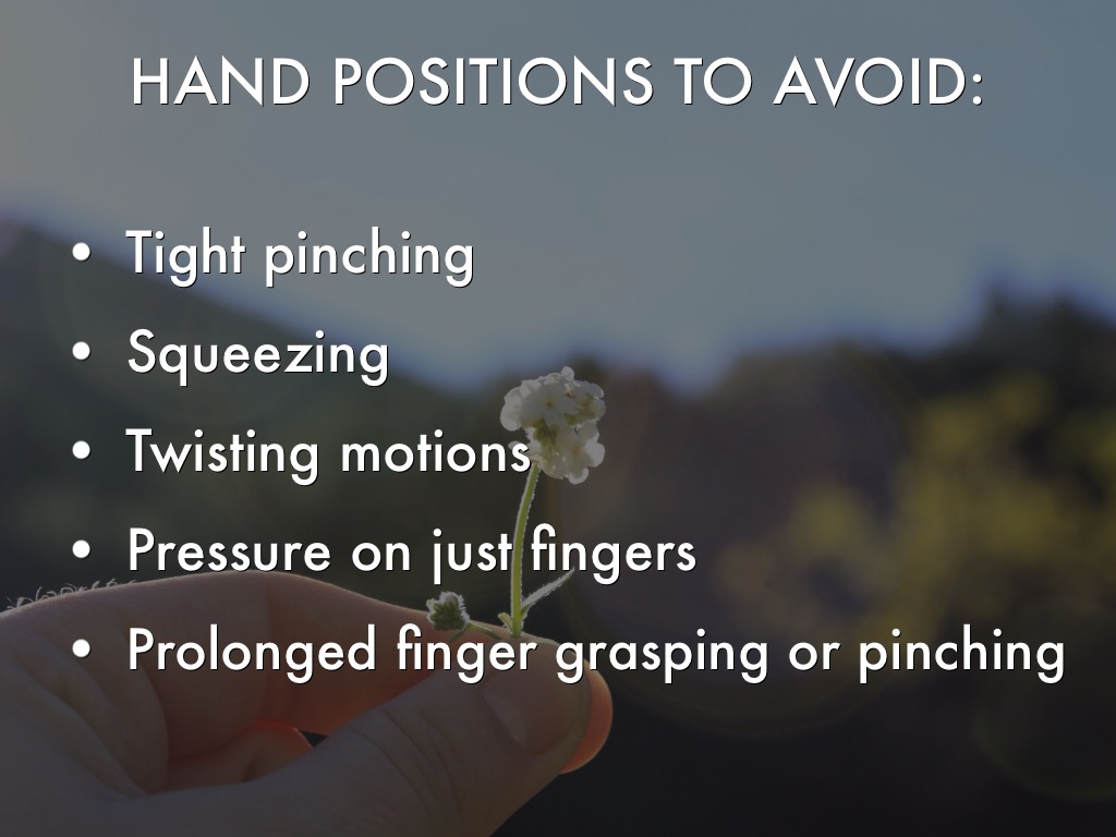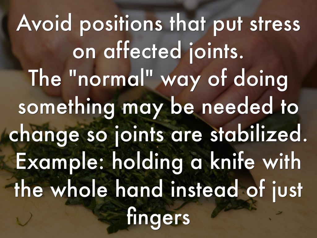 Avoid positions that put stress on affected joints. The "normal" way of doing something may be needed to change so joints are stabilized. Example: holding a knife with the whole hand instead of just fingers