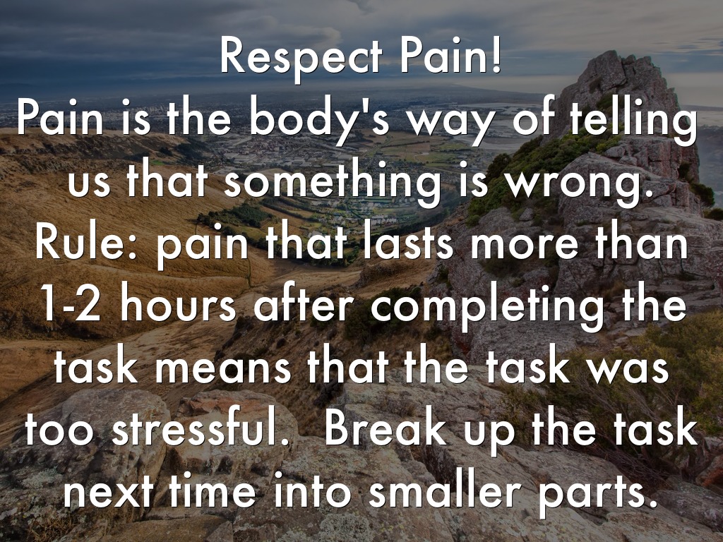 Respect Pain! Pain is the body's way of telling us that something is wrong. Rule: pain that lasts more than 1-2 hours after completing the task means that the task was too stressful. Break up the task next time into smaller parts.