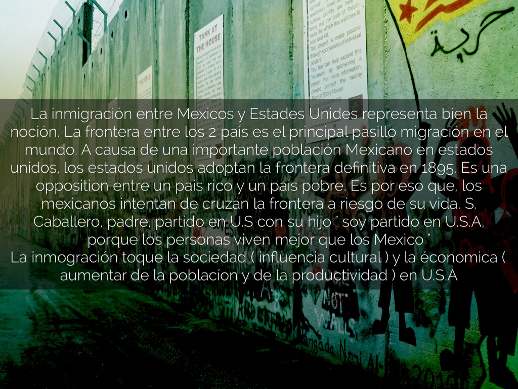 La inmigración entre Mexicos y Estades Unides representa bíen la noción. La frontera entre los 2 país es el principal pasillo migración en el mundo. A causa de una importante población Mexicano en estados unidos, los estados unidos adoptan la frontera definitiva en 1895. Es una opposition entre un país rico y un país pobre. Es por eso que, los mexicanos intentan de cruzan la frontera a riesgo de su vida. S. Caballero, padre, partido en U.S con su hijo " soy partido en U.S.A, porque los personas viven mejor que los Mexico "