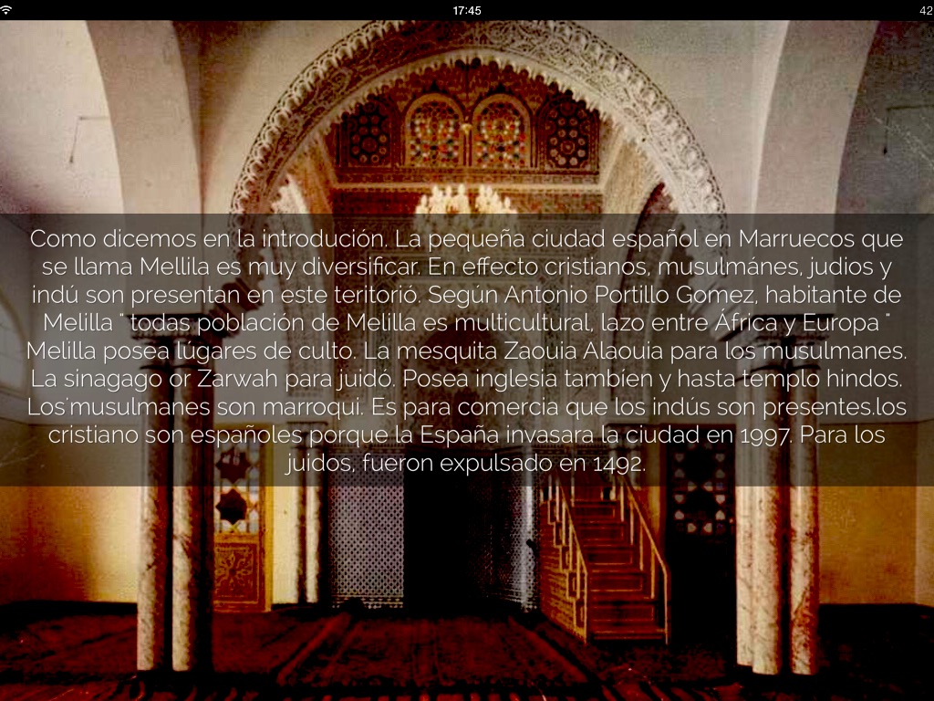 Como dicemos en la introdución. La pequeña ciudad español en Marruecos que se llama Mellila es muy diversificar. En effecto cristianos, musulmánes, judios y indú son presentan en este teritorió. Según Antonio Portillo Gomez, habitante de Melilla " todas población de Melilla es multicultural, lazo entre África y Europa "