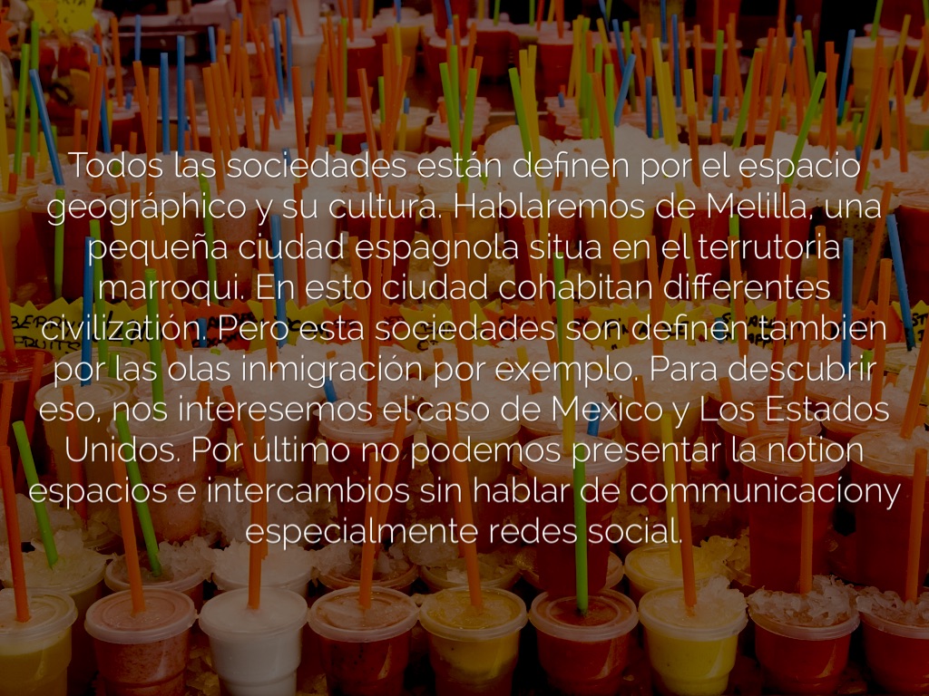Todos las sociedades están definen por el espacio geográphico y su cultura. Hablaremos de Melilla, una pequeña ciudad espagnola situa en el terrutoria marroqui. En esto ciudad cohabitan differentes civilizatión. Pero esta sociedades son definen tambien por las olas inmigración por exemplo. Para descubrir eso, nos interesemos el'caso de Mexico y Los Estados Unidos. Por último no podemos presentar la notion espacios e intercambios sin hablar de communicacíony especialmente redes social.