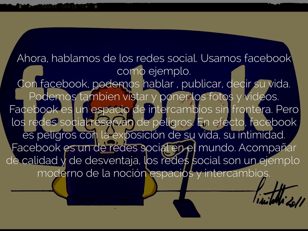 Con facebook, podemos hablar , publicar, decir su vida. Podemos tambíen vistar y poner los fotos y videos. Facebook es un espacio de intercambios sin frontera. Pero los redes social reservan de peligros. En efecto, facebook es peligros con la exposición de su vida, su intimidad.