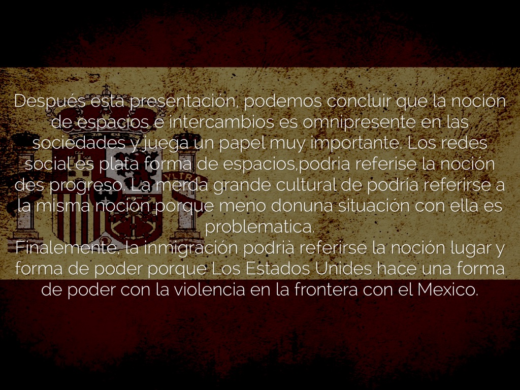 Después esta presentación, podemos concluir que la noción de espacios e intercambios es omnipresente en las sociedades y juega un papel muy importante. Los redes social es plata forma de espacios,podria referise la noción des progreso. La merda grande cultural de podría referirse a la misma noción porque meno donuna situación con ella es problematica.