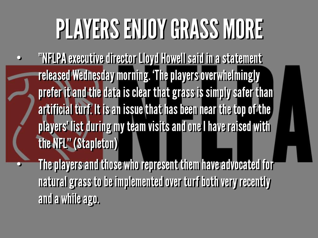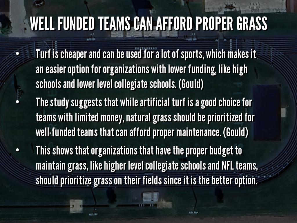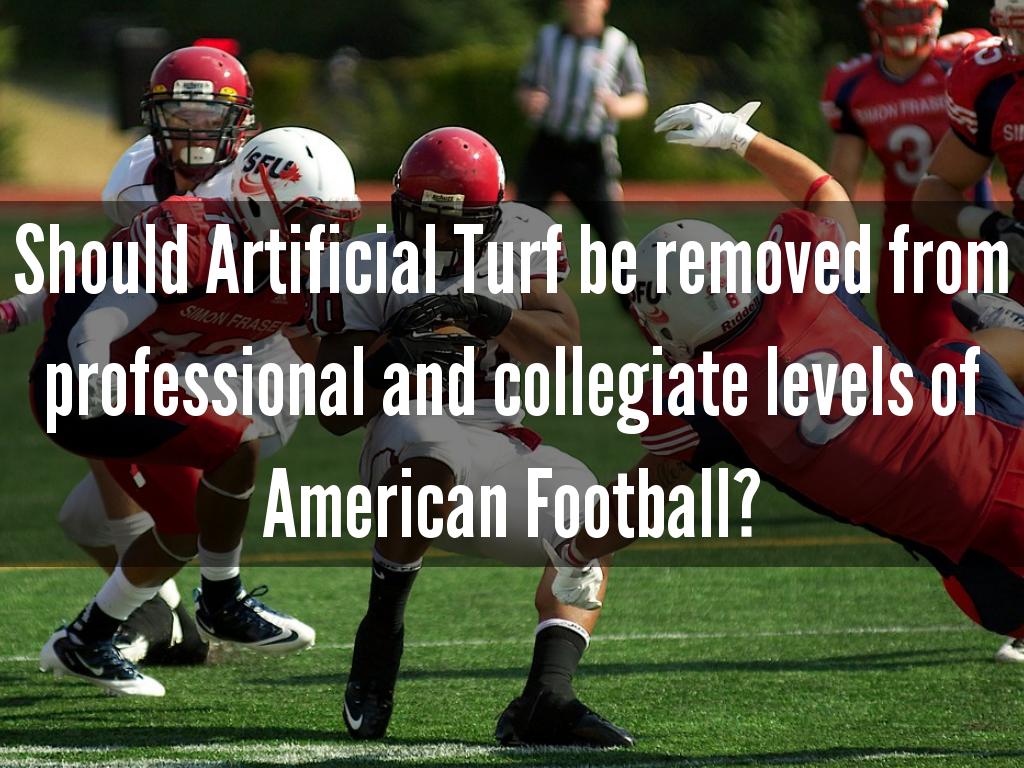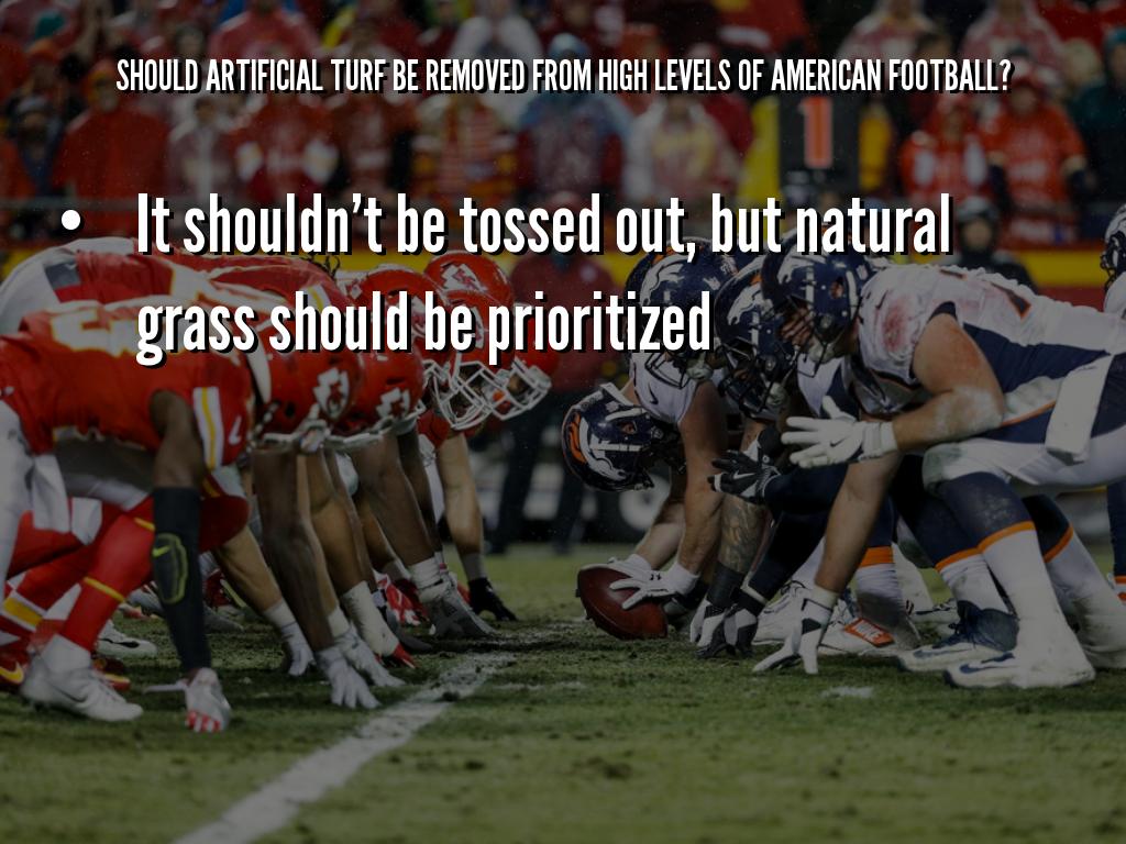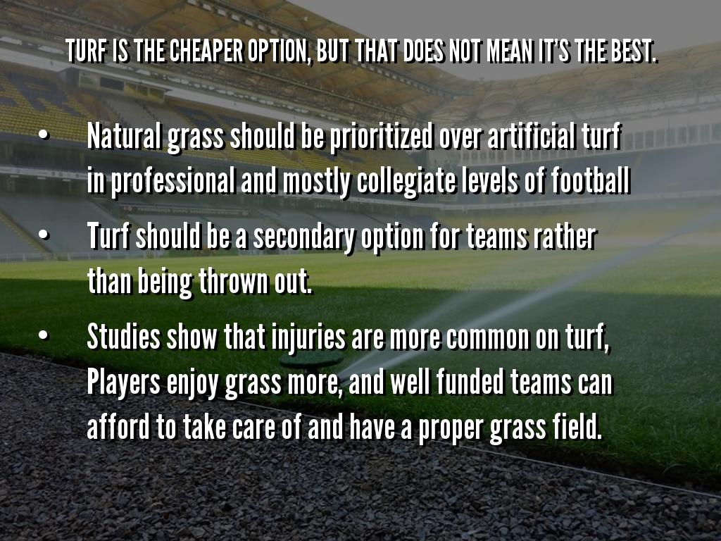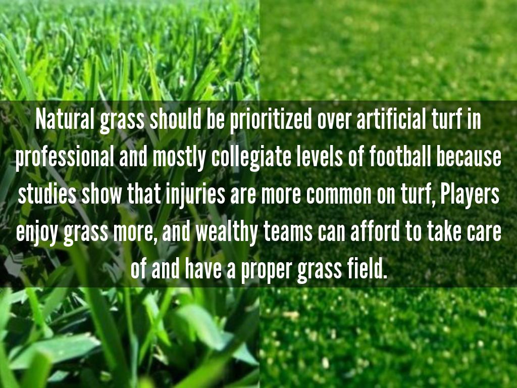 Natural grass should be prioritized over artificial turf in professional and mostly collegiate levels of football because studies show that injuries are more common on turf, Players enjoy grass more, and wealthy teams can afford to take care of and have a proper grass field.