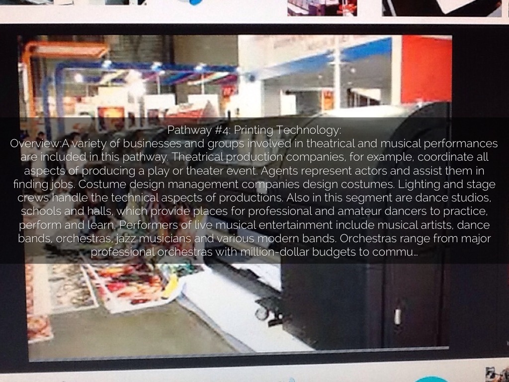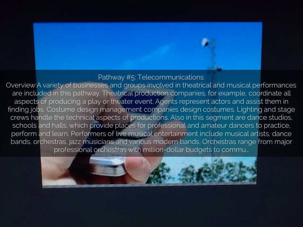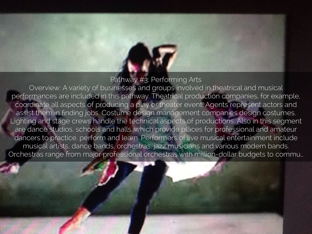 Overview:A variety of businesses and groups involved in theatrical and musical performances are included in this pathway. Theatrical production companies, for example, coordinate all aspects of producing a play or theater event. Agents represent actors and assist them in finding jobs. Costume design management companies design costumes. Lighting and stage crews handle the technical aspects of productions. Also in this segment are dance studios, schools and halls, which provide places for professional and amateur dancers to practice, perform and learn. Performers of live musical entertainment include musical artists, dance bands, orchestras, jazz musicians and various modern bands. Orchestras range from major professional orchestras with million-dollar budgets to community orchestras often with part-time schedules.