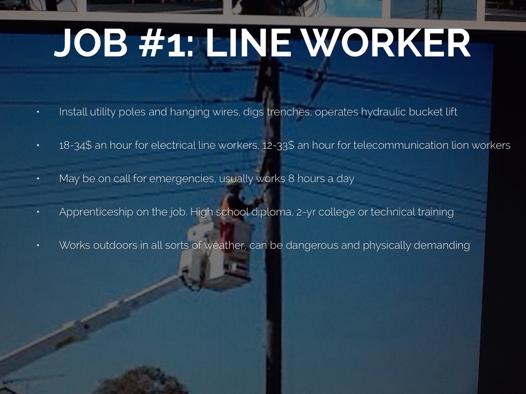 - Install utility poles and hanging wires, digs trenches, operates hydraulic bucket lift