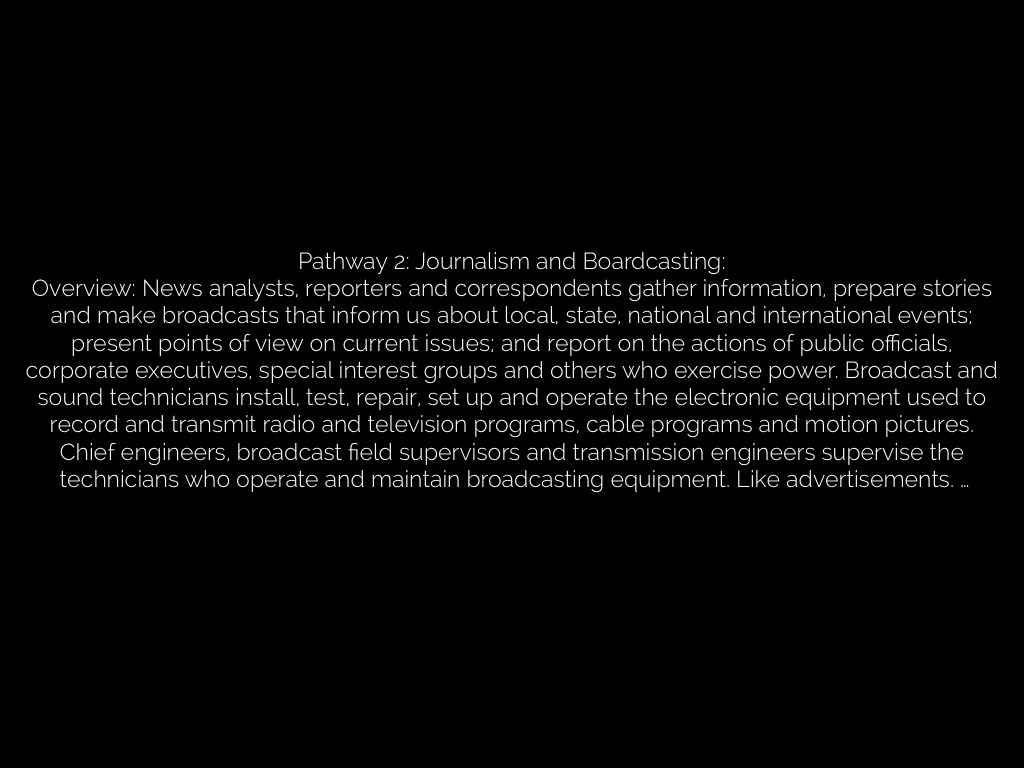 Overview: News analysts, reporters and correspondents gather information, prepare stories and make broadcasts that inform us about local, state, national and international events; present points of view on current issues; and report on the actions of public officials, corporate executives, special interest groups and others who exercise power. Broadcast and sound technicians install, test, repair, set up and operate the electronic equipment used to record and transmit radio and television programs, cable programs and motion pictures. Chief engineers, broadcast field supervisors and transmission engineers supervise the technicians who operate and maintain broadcasting equipment. Like advertisements.