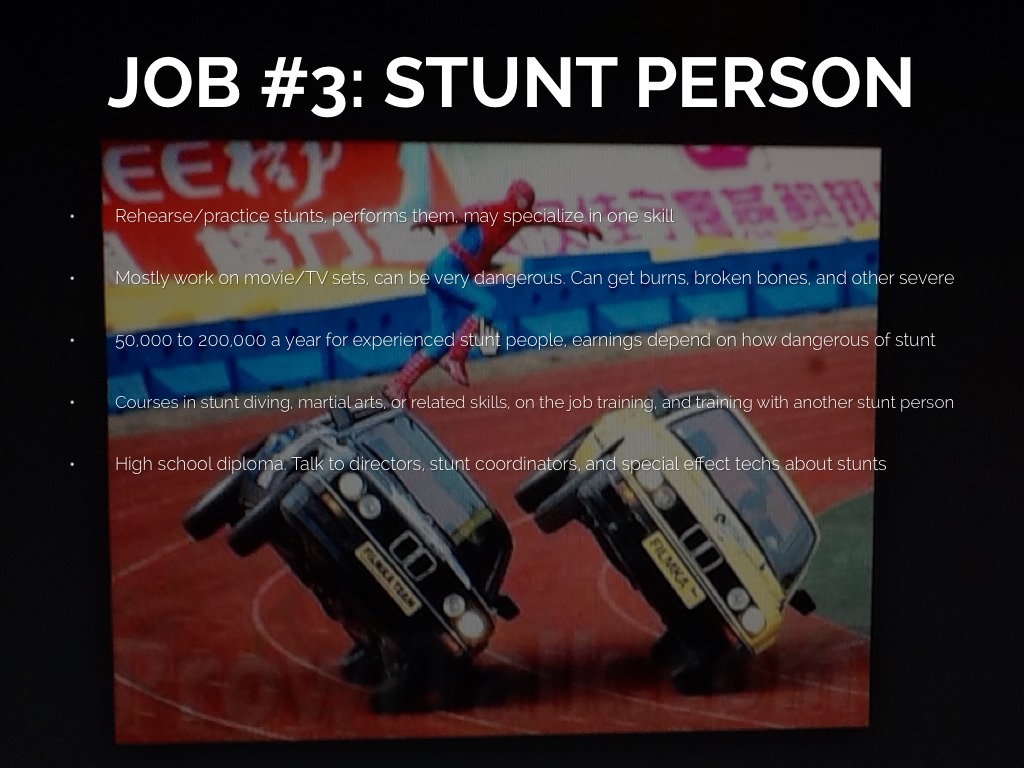 - Mostly work on movie/TV sets, can be very dangerous. Can get burns, broken bones, and other severe