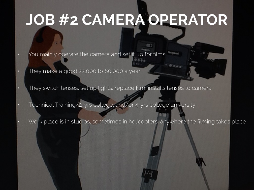 - Works in studios, form dangerous situations, may carry heavy equipment, tight deadlines
