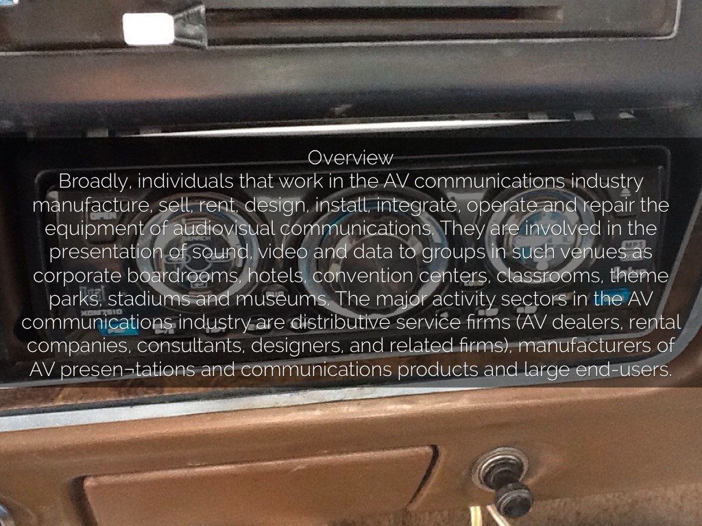 Broadly, individuals that work in the AV communications industry manufacture, sell, rent, design, install, integrate, operate and repair the equipment of audiovisual communications. They are involved in the presentation of sound, video and data to groups in such venues as corporate boardrooms, hotels, convention centers, classrooms, theme parks, stadiums and museums. The major activity sectors in the AV communications industry are distributive service firms (AV dealers, rental companies, consultants, designers, and related firms), manufacturers of AV presen¬tations and communications products and large end-users.