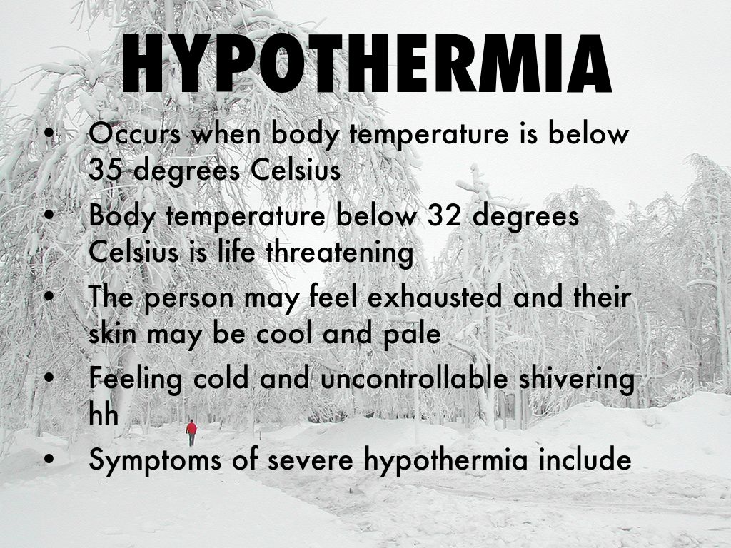 Symptoms of severe hypothermia include slowing of heart rate and breathing, dilated pupils, and coma