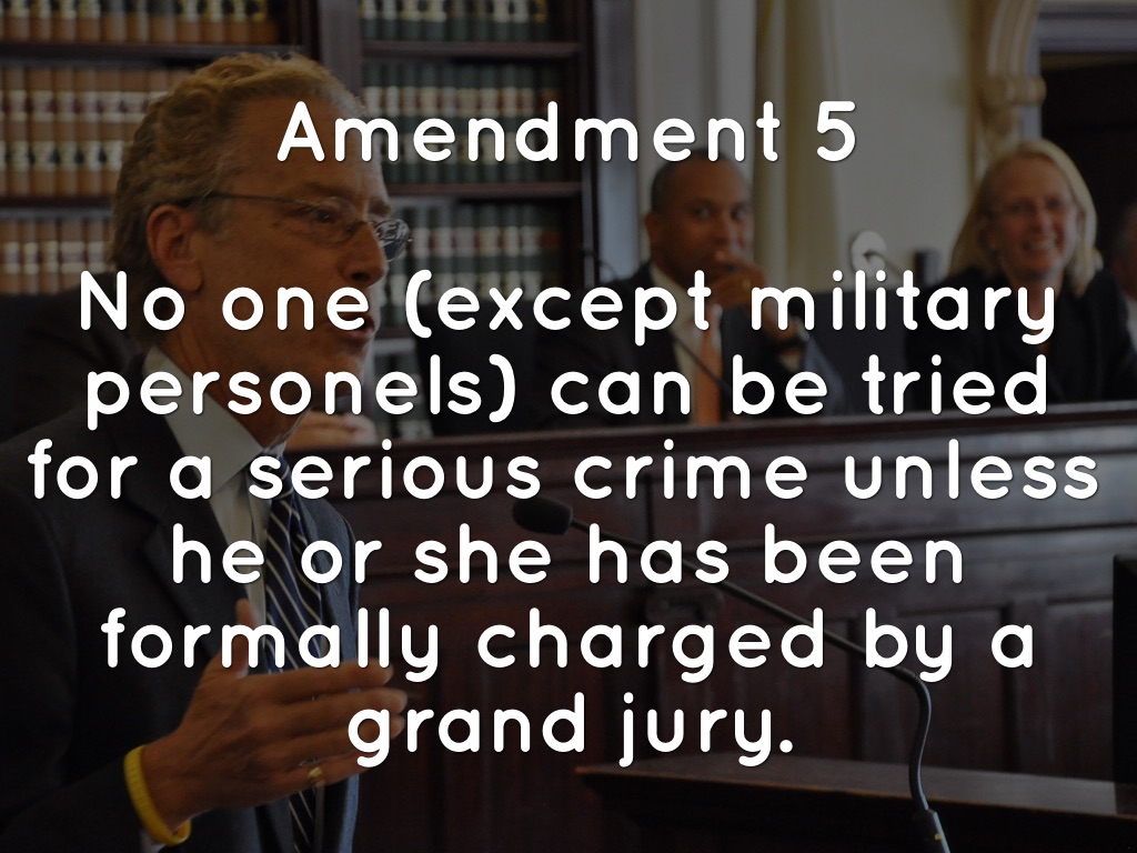 No one (except military personels) can be tried for a serious crime unless he or she has been formally charged by a grand jury.