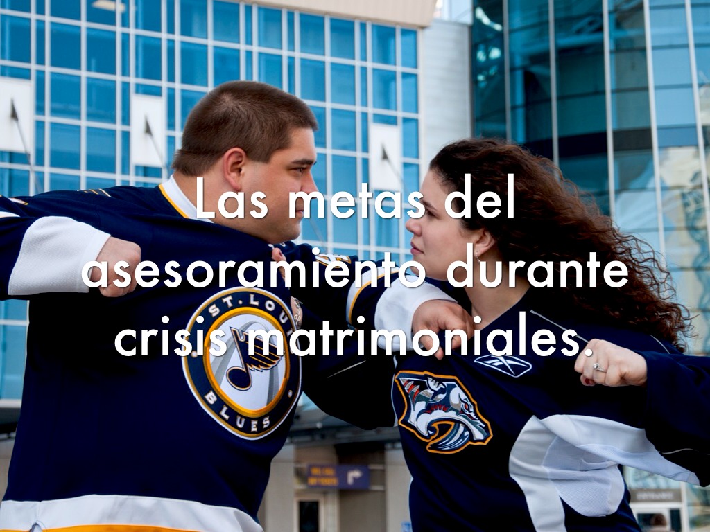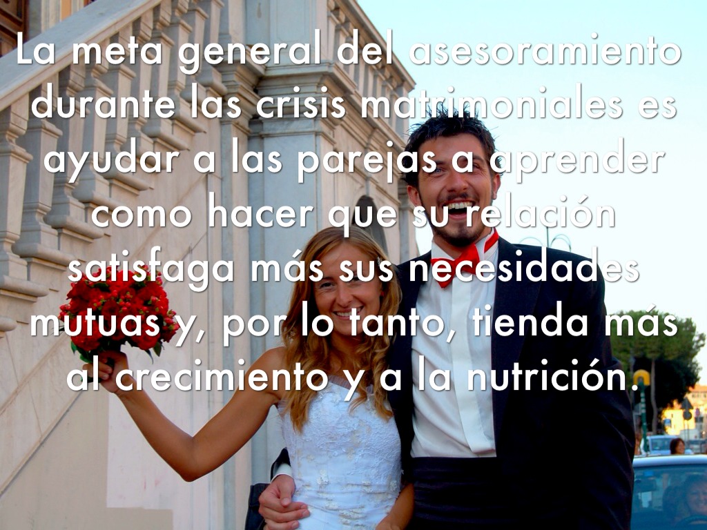 La meta general del asesoramiento durante las crisis matrimoniales es ayudar a las parejas a aprender como hacer que su relación satisfaga más sus necesidades mutuas y, por lo tanto, tienda más al crecimiento y a la nutrición.