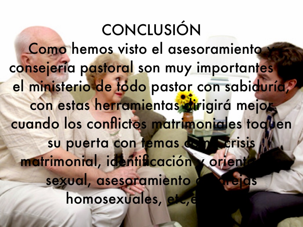 Como hemos visto el asesoramiento y consejería pastoral son muy importantes en el ministerio de todo pastor con sabiduría, con estas herramientas dirigirá mejor cuando los conflictos matrimoniales toquen su puerta con temas como crisis matrimonial, identificación y orientación sexual, asesoramiento a parejas homosexuales, etc,etc,etc.