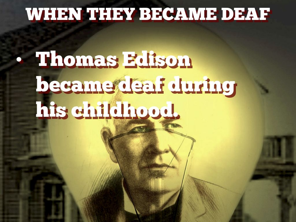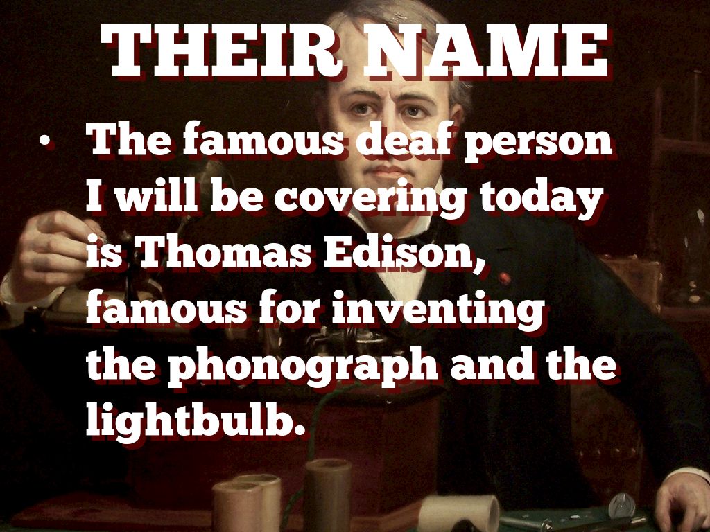 • The famous deaf person I will be covering today is Thomas Edison, famous for inventing the phonograph and the lightbulb.