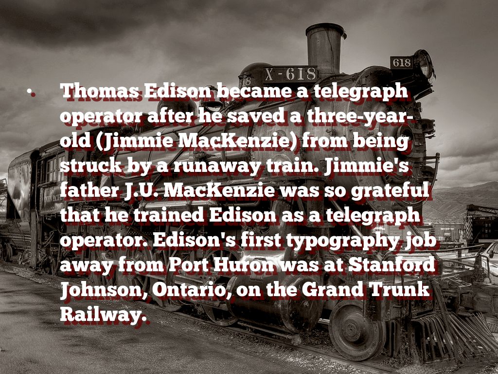 • Thomas Edison became a telegraph operator after he saved a three-year-old (Jimmie MacKenzie) from being struck by a runaway train. Jimmie's father J.U. MacKenzie was so grateful that he trained Edison as a telegraph operator. Edison's first typography job away from Port Huron was at Stanford Johnson, Ontario, on the Grand Trunk Railway.