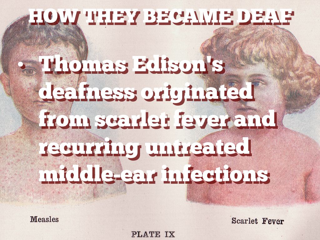 • Thomas Edison's deafness originated from scarlet fever and recurring untreated middle-ear infections