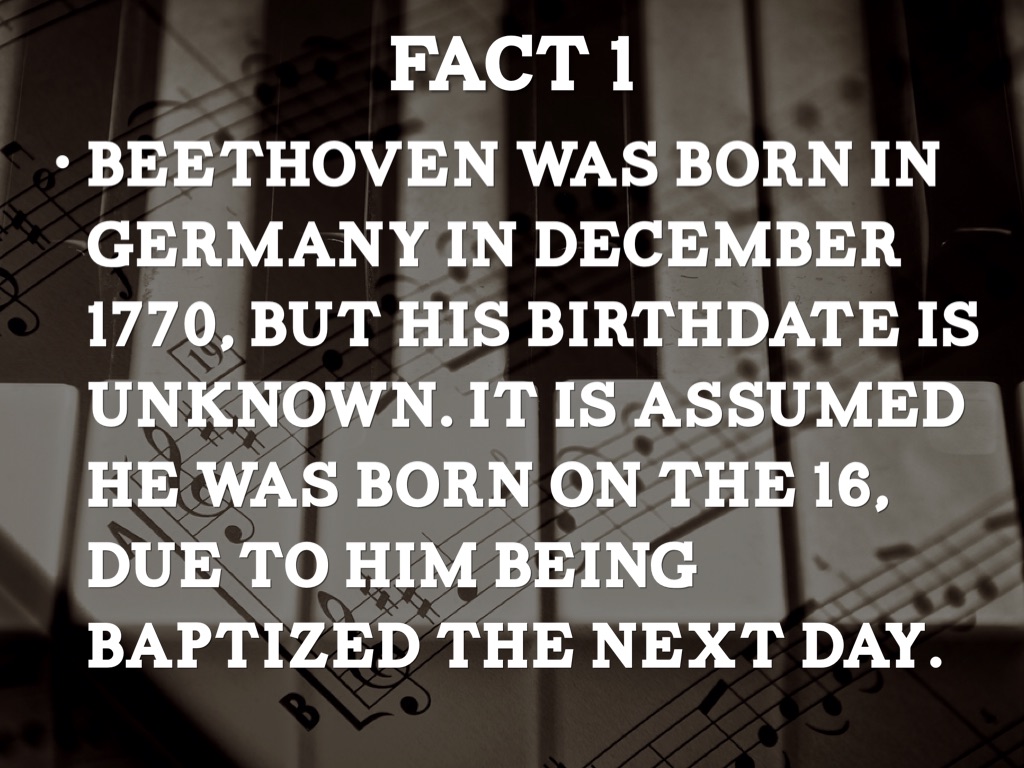 Beethoven was born in Germany in December 1770, but his birthdate is unknown. It is assumed he was born on the 16, due to him being baptized the next day.