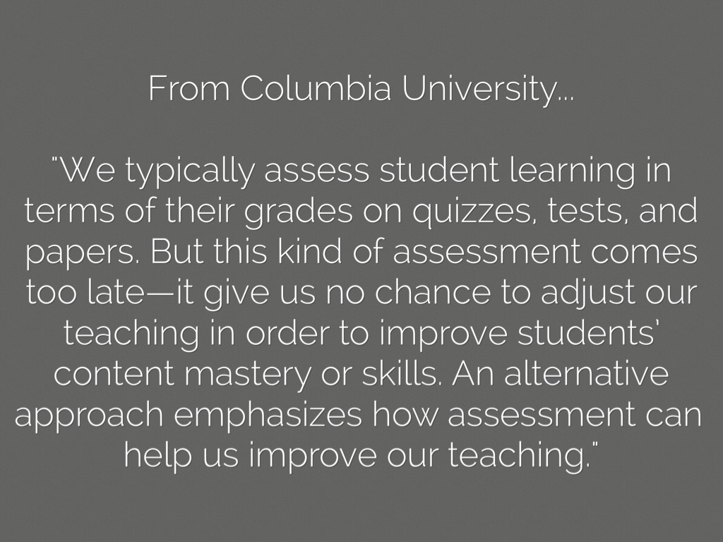 "We typically assess student learning in terms of their grades on quizzes, tests, and papers. But this kind of assessment comes too late—it give us no chance to adjust our teaching in order to improve students’ content mastery or skills. An alternative approach emphasizes how assessment can help us improve our teaching."