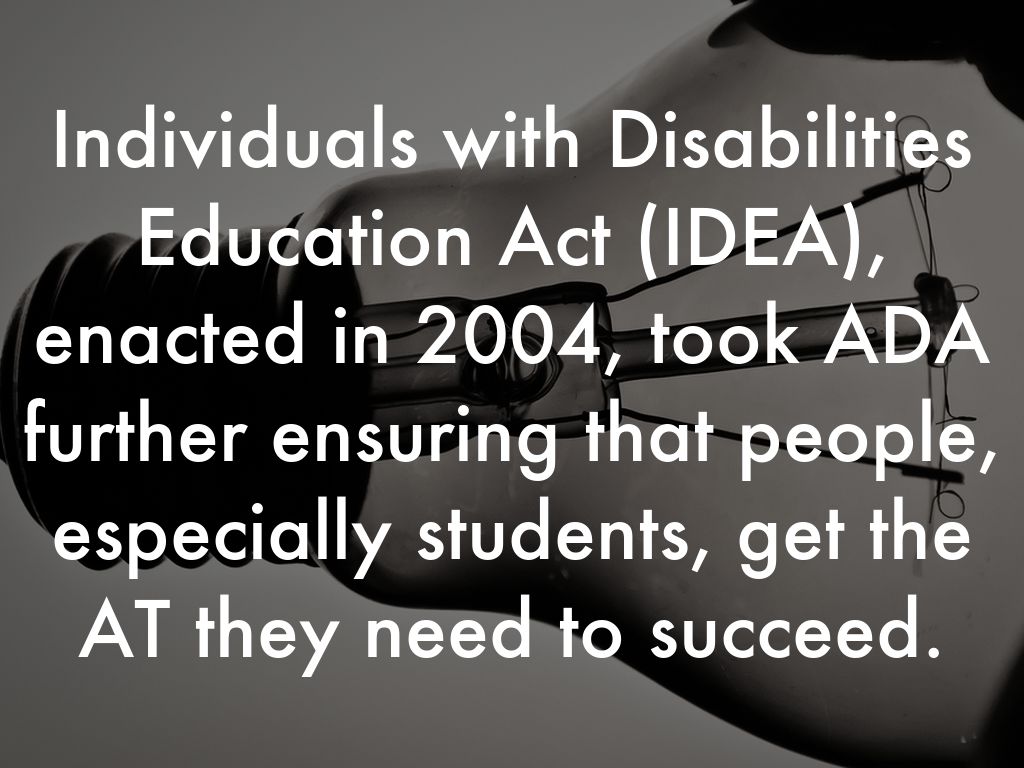 Individuals with Disabilities Education Act (IDEA), enacted in 2004, took ADA further ensuring that people, especially students, get the AT they need to succeed.