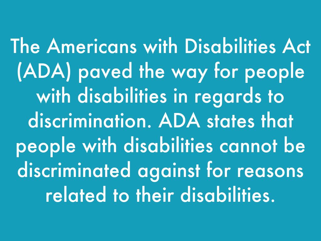 The Americans with Disabilities Act (ADA) paved the way for people with disabilities in regards to discrimination. ADA states that people with disabilities cannot be discriminated against for reasons related to their disabilities.