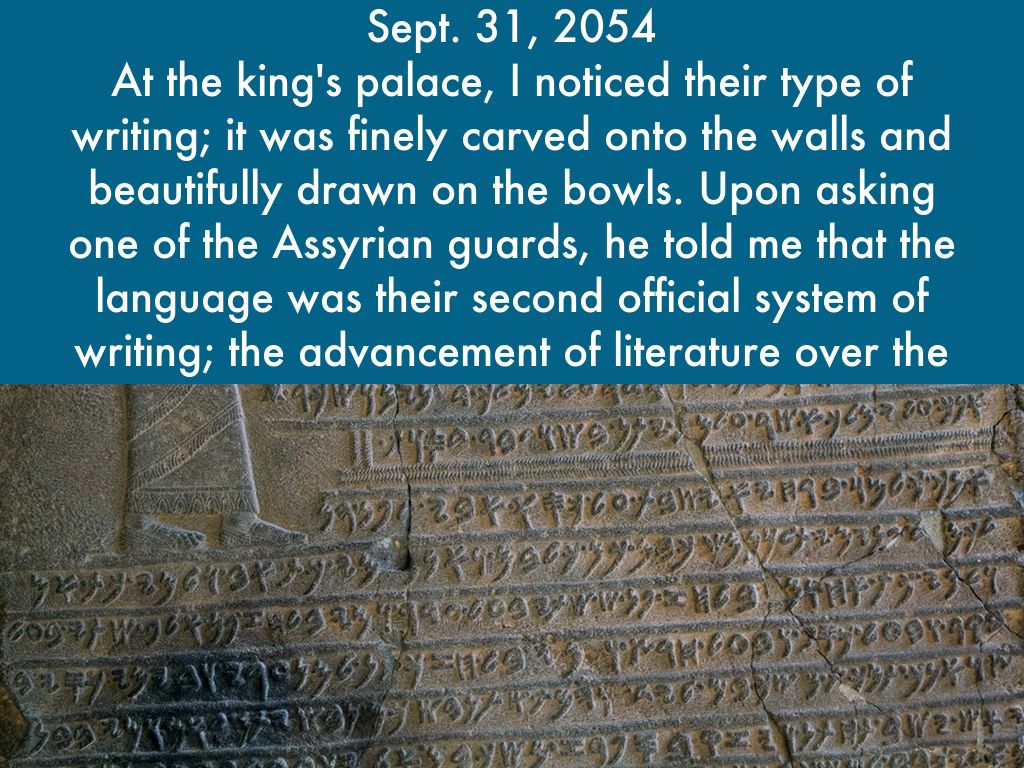 At the king's palace, I noticed their type of writing; it was finely carved onto the walls and beautifully drawn on the bowls. Upon asking one of the Assyrian guards, he told me that the language was their second official system of writing; the advancement of literature over the years was incredible. The Assyrians' writing system had come a long way: from the Sumerians' cuneiform to the Akkadian Language to the Aramaic Language.
