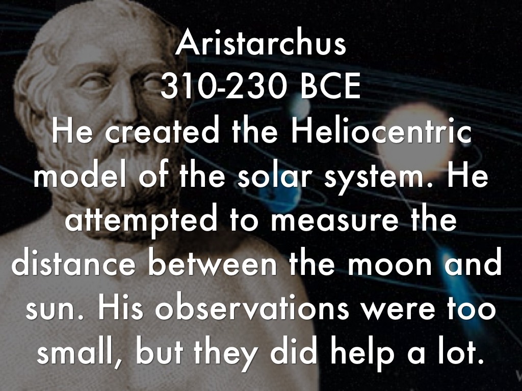 He created the Heliocentric model of the solar system. He attempted to measure the distance between the moon and sun. His observations were too small, but they did help a lot.