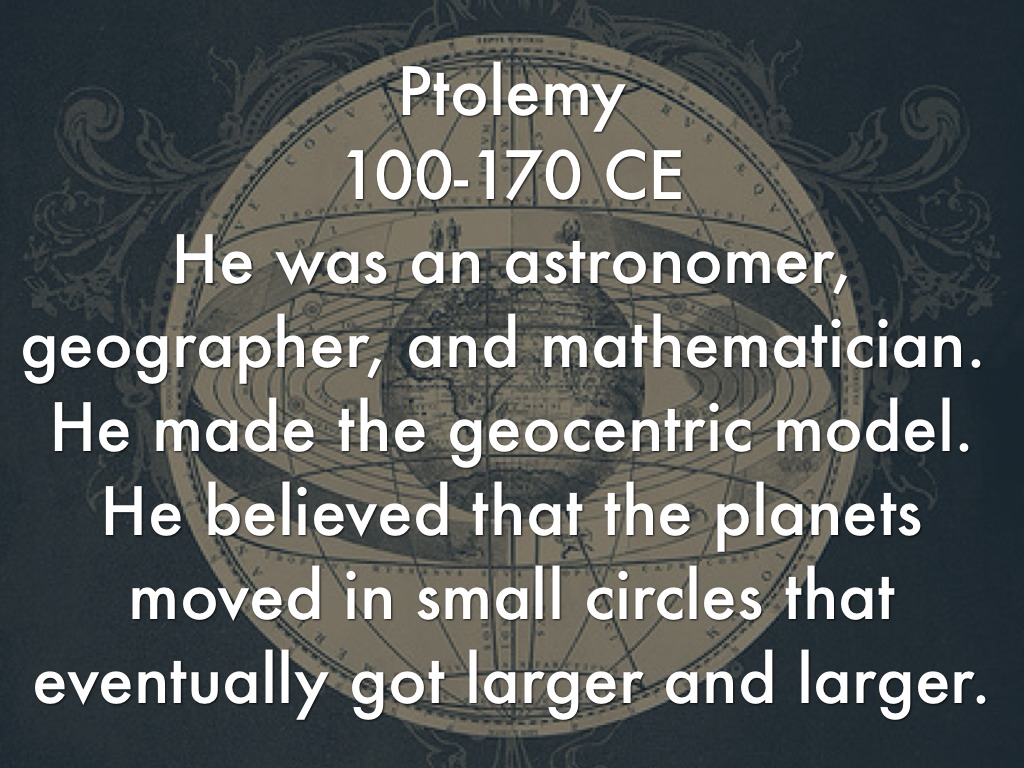 He was an astronomer, geographer, and mathematician. He made the geocentric model. He believed that the planets moved in small circles that eventually got larger and larger.
