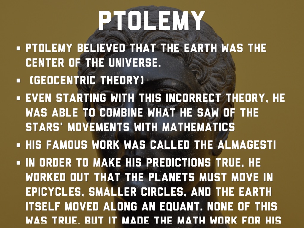 • In order to make his predictions true, he worked out that the planets must move in epicycles, smaller circles, and the Earth itself moved along an equant. None of this was true, but it made the math work for his predictions.