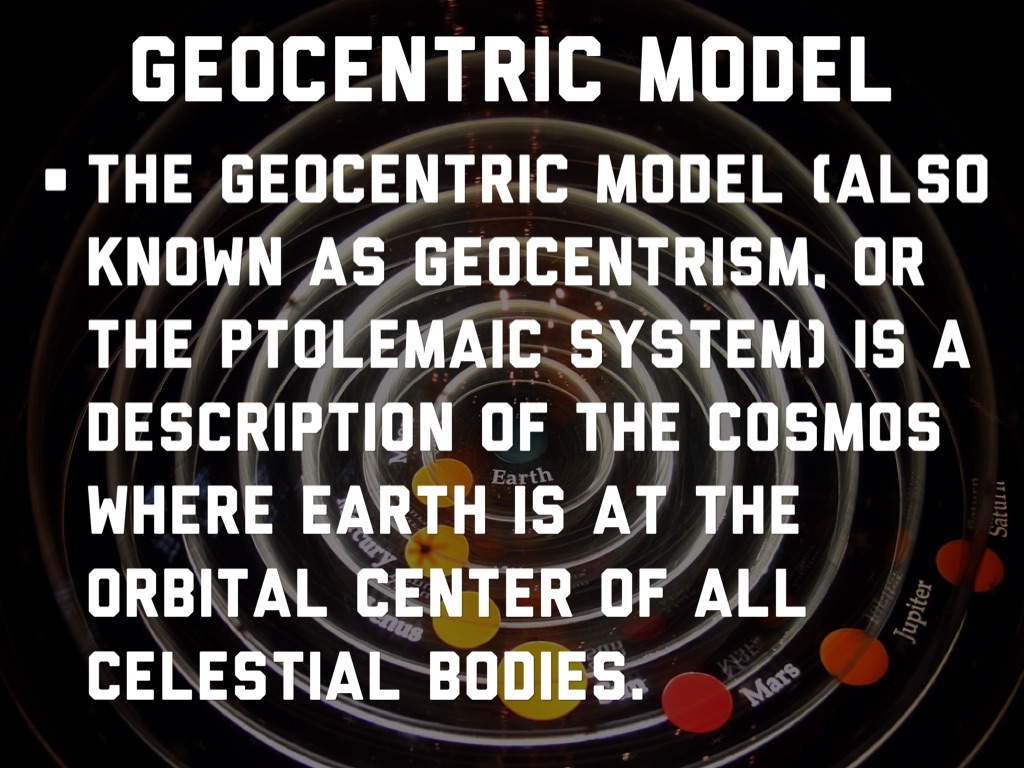 • the Geocentric Model (also known as geocentrism, or the Ptolemaic system) is a description of the cosmos where Earth is at the orbital center of all celestial bodies.