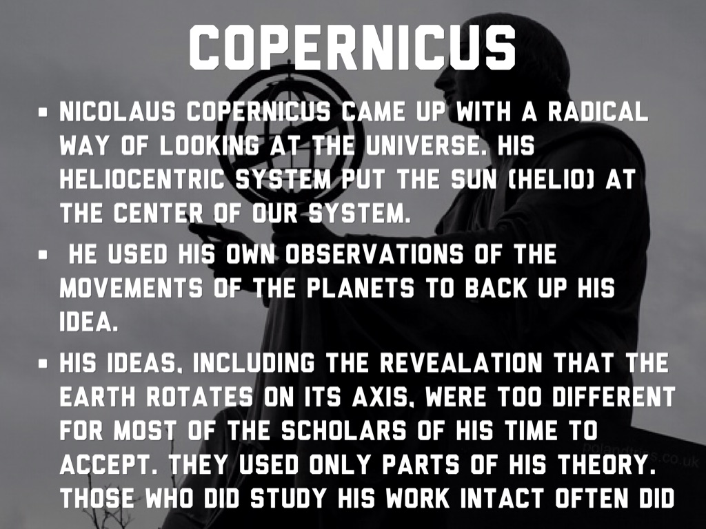 • Nicolaus Copernicus came up with a radical way of looking at the Universe. His heliocentric system put the Sun (helio) at the center of our system.