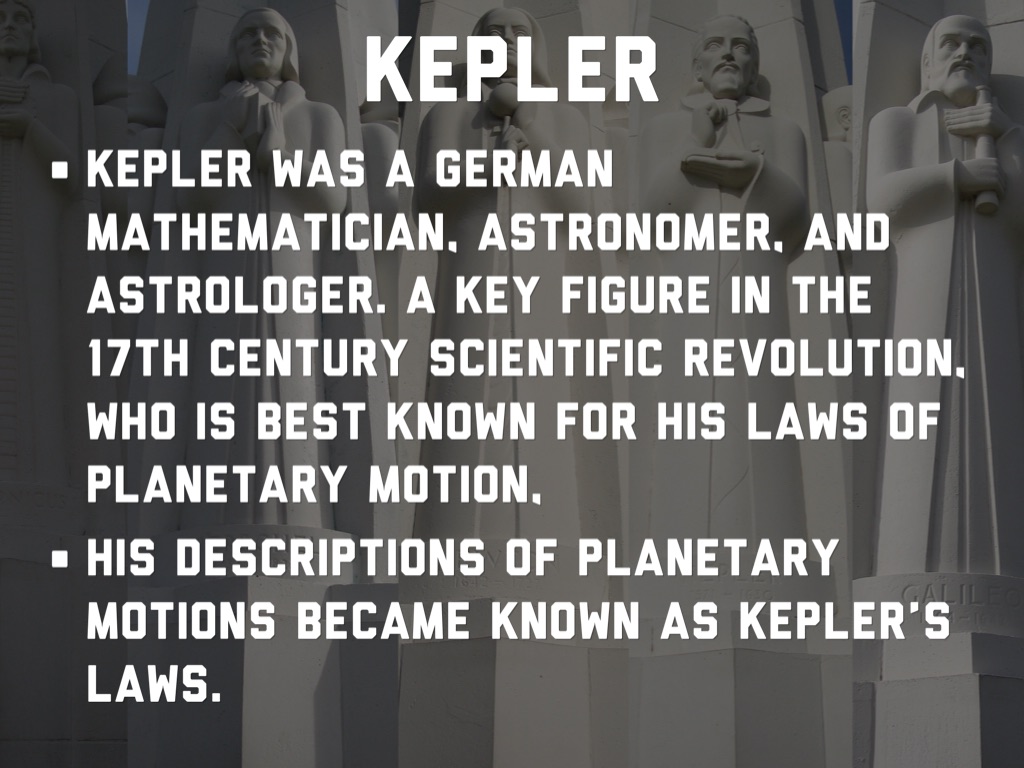 • Kepler was a German mathematician, astronomer, and astrologer. A key figure in the 17th century scientific revolution, who is best known for his laws of planetary motion,