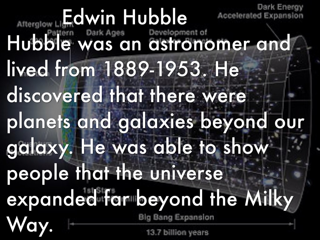 Hubble was an astronomer and lived from 1889-1953. He discovered that there were planets and galaxies beyond our galaxy. He was able to show people that the universe expanded far beyond the Milky Way.