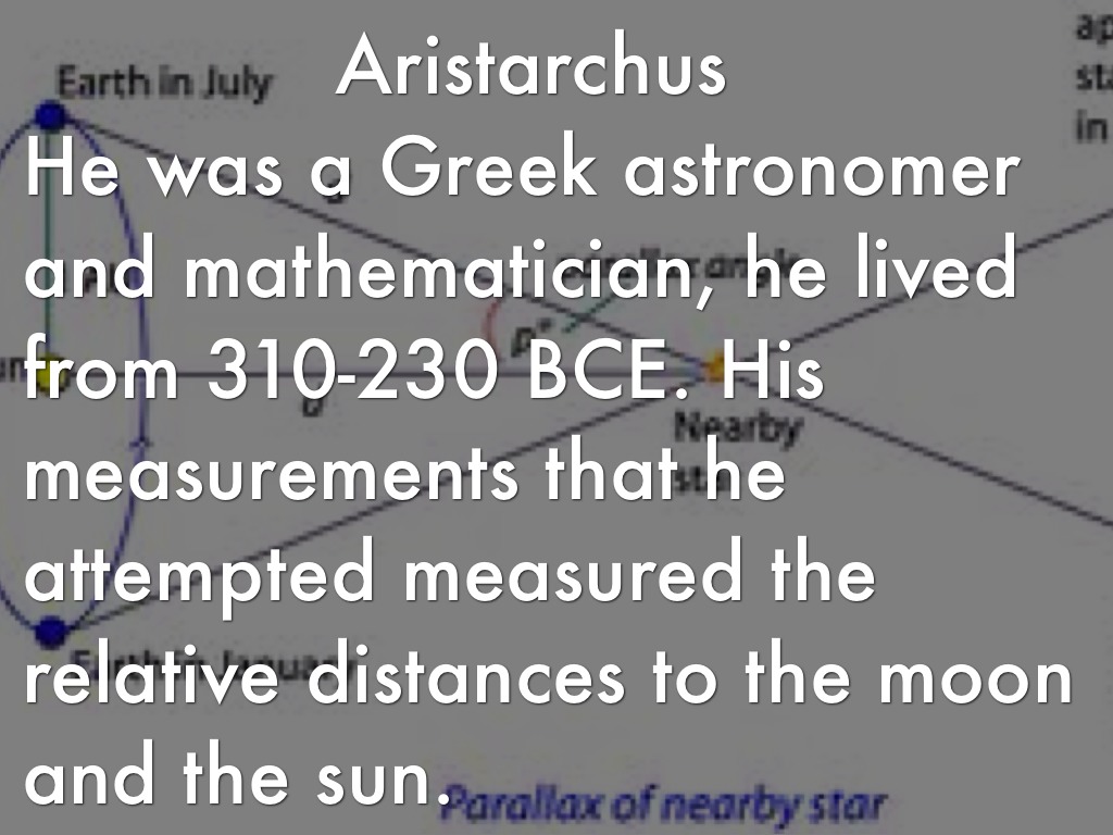 He was a Greek astronomer and mathematician, he lived from 310-230 BCE. His measurements that he attempted measured the relative distances to the moon and the sun.