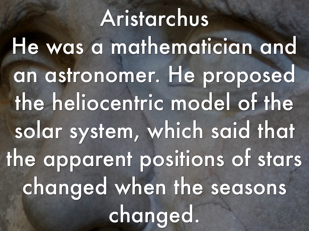 He was a mathematician and an astronomer. He proposed the heliocentric model of the solar system, which said that the apparent positions of stars changed when the seasons changed.
