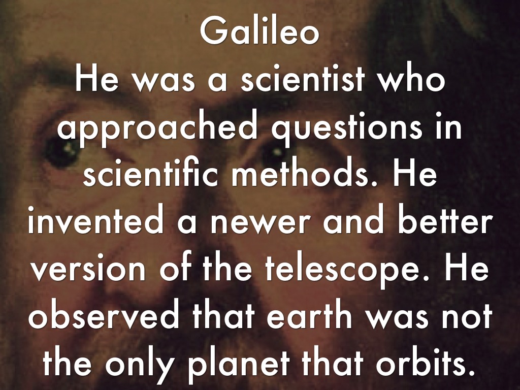 He was a scientist who approached questions in scientific methods. He invented a newer and better version of the telescope. He observed that earth was not the only planet that orbits.
