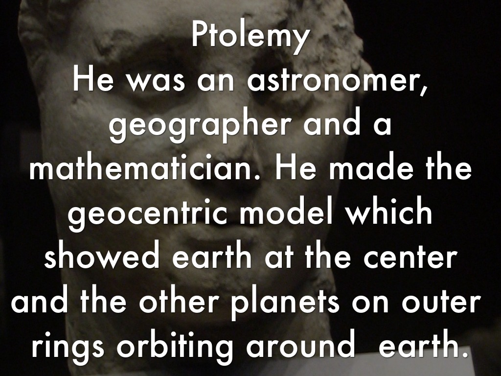 He was an astronomer, geographer and a mathematician. He made the geocentric model which showed earth at the center and the other planets on outer rings orbiting around earth.